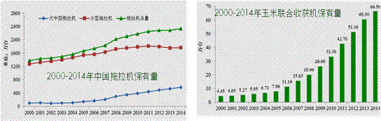 技術(shù)進(jìn)步明顯,主要產(chǎn)品產(chǎn)量增長(zhǎng)迅速,滿足國(guó)內(nèi)90%市場(chǎng)需求。大馬力拖拉機(jī)、大型的聯(lián)合收割機(jī)、青飼料收獲機(jī)等主要產(chǎn)品性能有了很大提升,基本滿足國(guó)內(nèi)市場(chǎng)。拖拉機(jī)大型化、配套化的趨勢(shì)明顯,2014年大中型拖拉機(jī)保有量達(dá)572萬(wàn)臺(tái),同比增長(zhǎng)8.6%。糧食生產(chǎn)急需的水稻插秧機(jī)、玉米聯(lián)合收獲機(jī)保持高速增長(zhǎng),保有量分別達(dá)66.5萬(wàn)臺(tái)、34.3萬(wàn)臺(tái),同比分別增長(zhǎng)9.7%、20.1%。